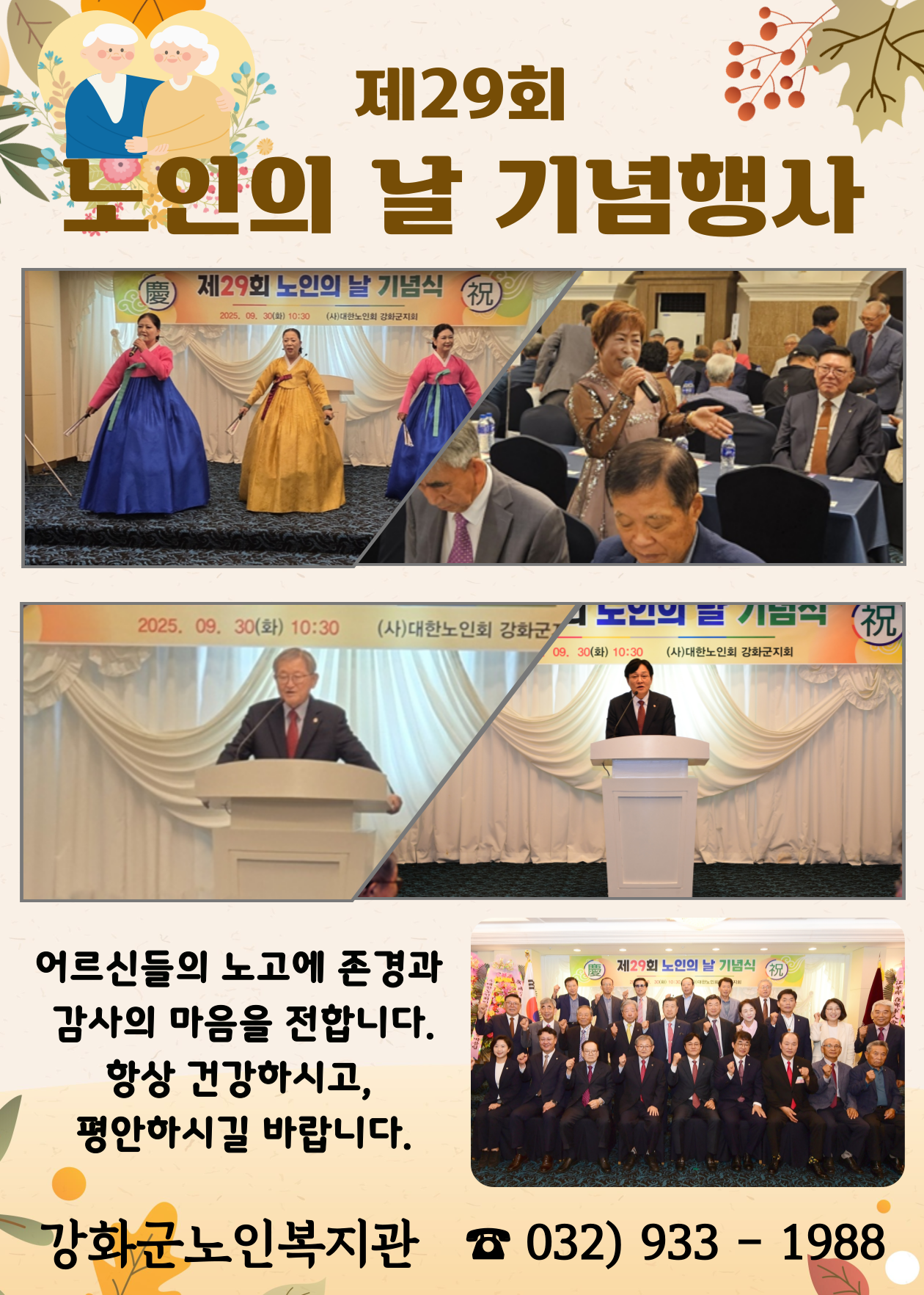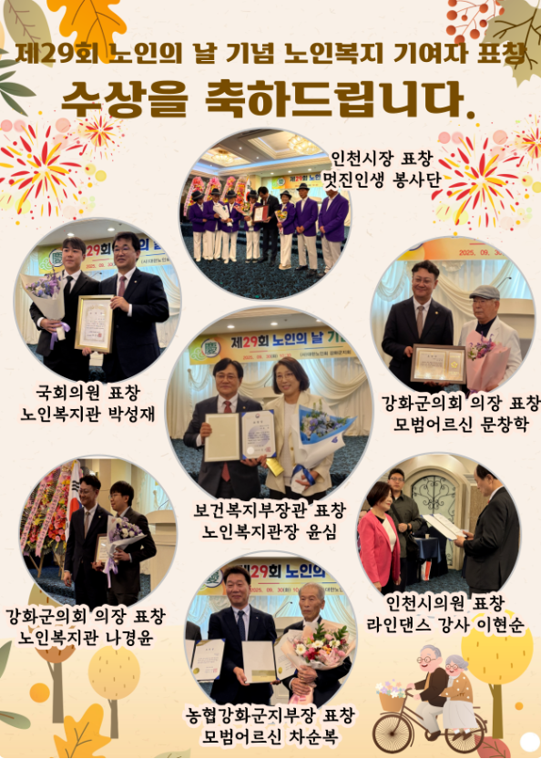제29회 노인의 날을 맞이하여 다채로운 공연과 함께 노인강령 낭독, 표장장 및 감사패 수여, 기념사, 축사, 격려사 등을 통해 어르신들의 노고에 감사와 공경의 마음을 전하는 시간을 가졌습니다.
