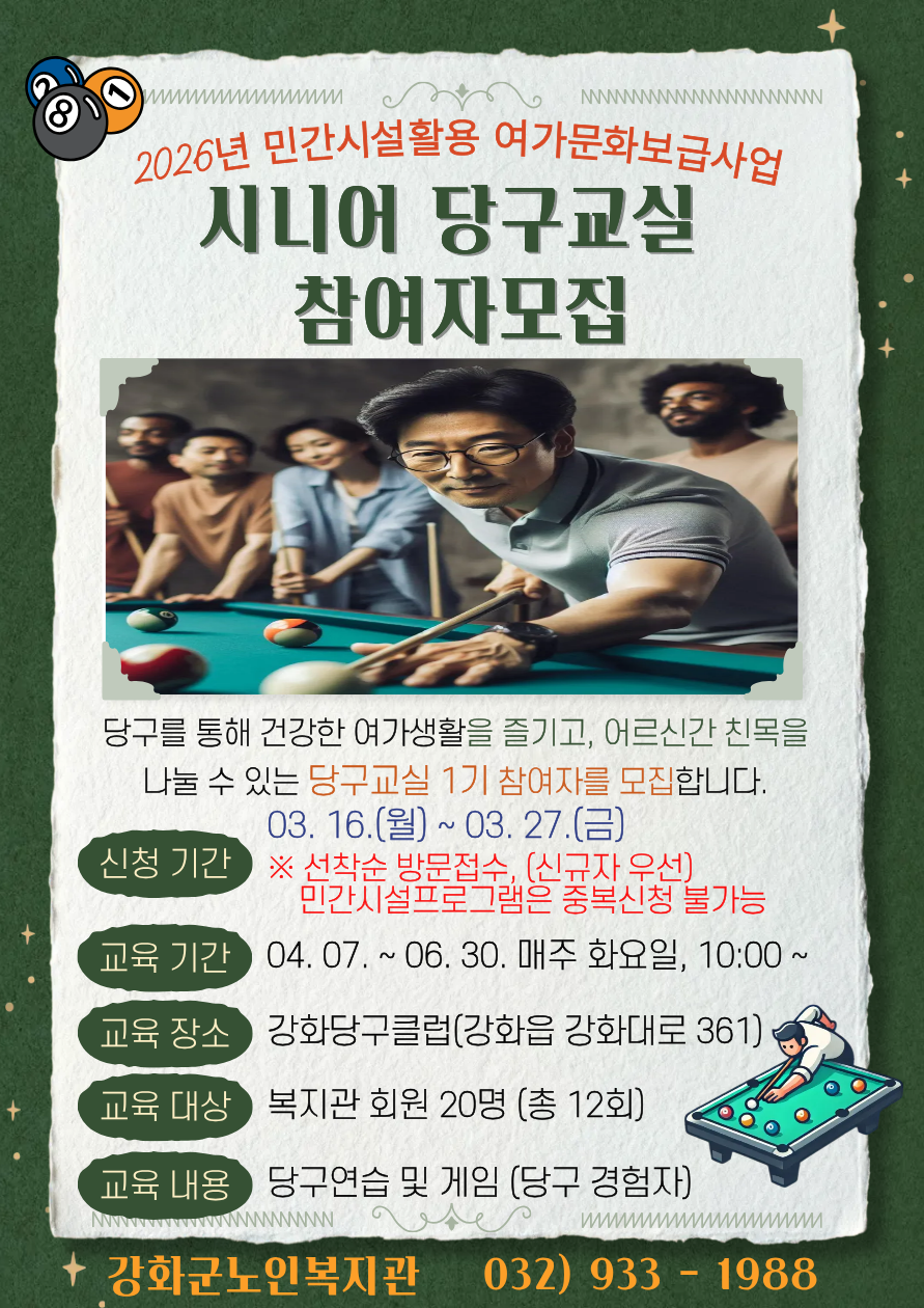 2026년 민간시설활용 여가문화보급사업 시니어 당구교실 참여자 모집을 시작합니다. 많은 참여 부탁드립니다!