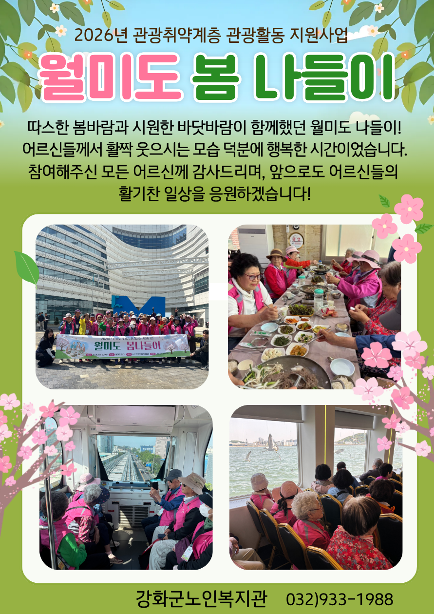 인천광역시관광협회의 지원으로 2026년 관광취약계층 관광활동 지원사업의 일환으로 월미도로 따뜻한 봄 나들이를 다녀왔습니다????싱그러운 봄바람과 함께 소중한 추억을 만들며 어르신들께 웃음과 활력을 전하는 뜻깊은 시간이었습니다.
