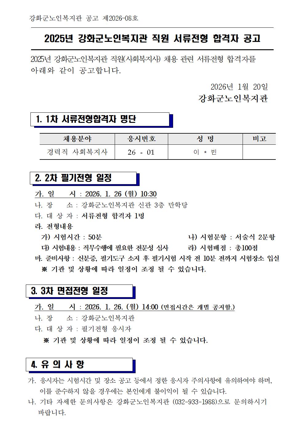 2025년 강화군노인복지관 직원(사회복지사) 채용 서류전형 합격자 공고