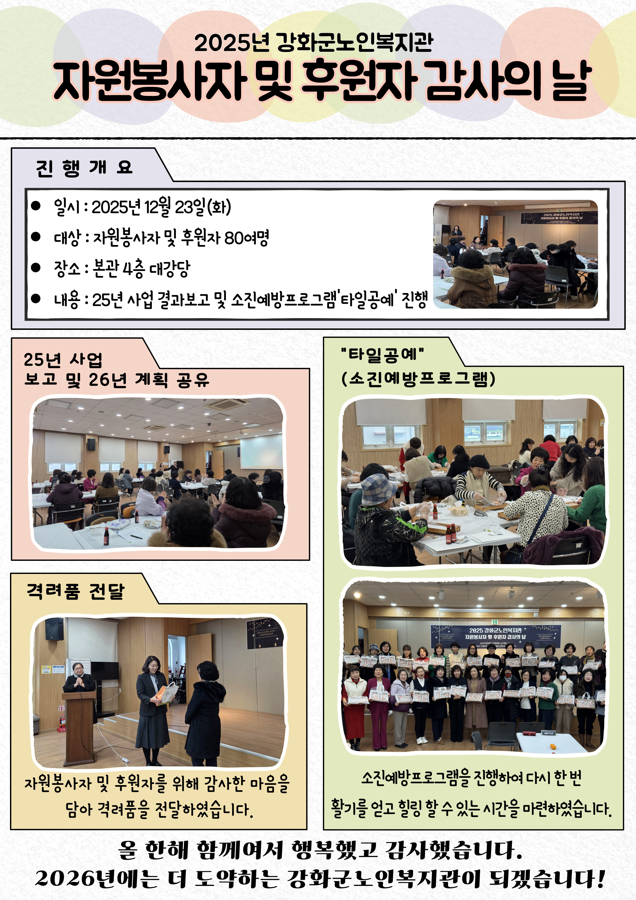 자원봉사자 및 후원자를 대상으로 올 한 해 사업에 대한 결과 공유와 소진예방프로그램, 격려품 전달 등을 진행하였습니다. 다가오는 26년도에도 잘 부탁드리겠습니다!